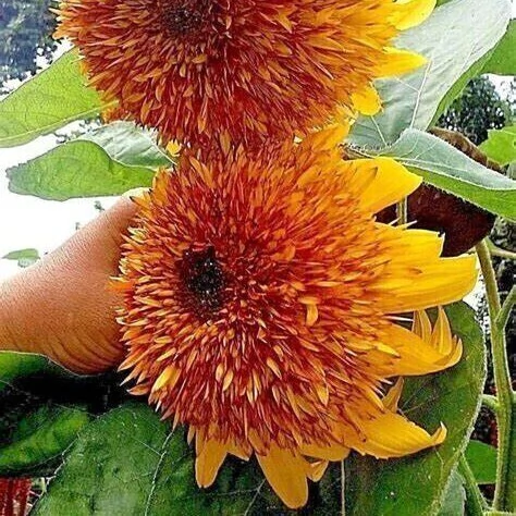 - Girasol con múltiples pétalos en el centro de la flor. Multiflora. Mezcla de colores naranja y amarillo