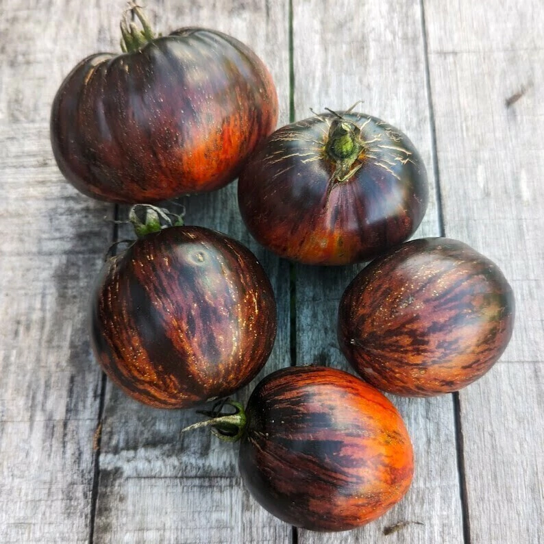 - Tomate totalmente negro que madura a hermosos frutos tricolores, con vetas. Excelente sabor complejo. - Es una variedad de crecimiento indeterminado, hay que entutorar con cañas o varillas altas. Podar chupones o brotes axilares.- Época de siembra: Fin de invierno y primavera